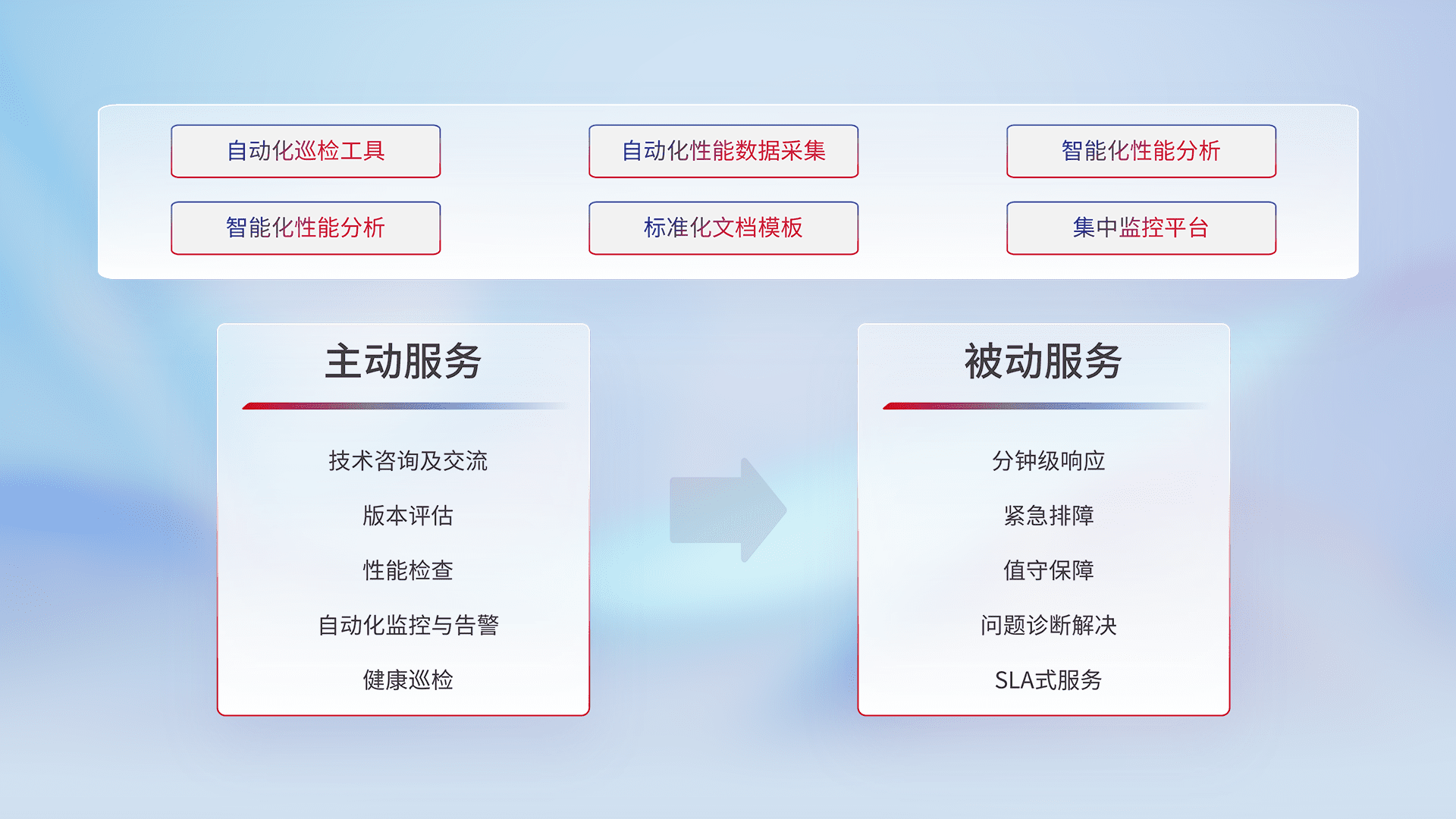 智能化工具和标准化文档,,,,保障服务质量,,,提供主动服务(包含技术咨询、、、、版本评估、、、性能检查、、、自动化监控与告警、、、、健康巡检)和被动服务包含(分钟级响应、、、、紧急排障、、、、值守保障、、、问题诊断解决、、、、SLA服务)。。。